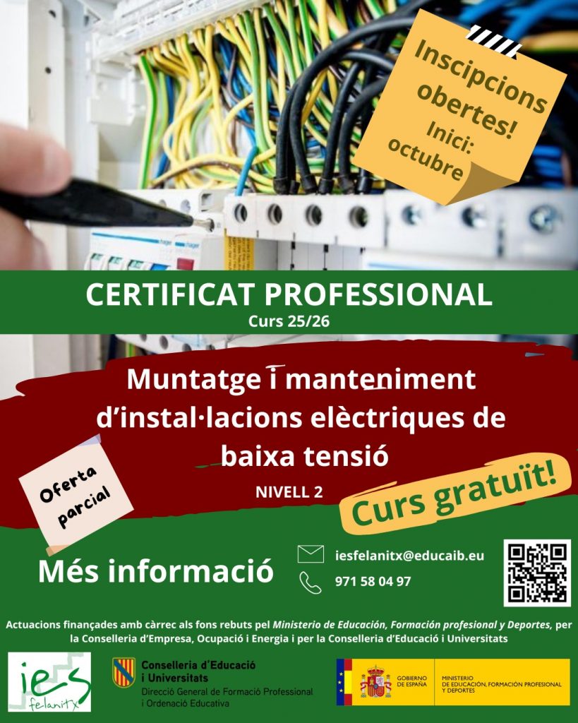 ELEE0109 – Muntatge i manteniment d’instal·lacions elèctriques de baixa tensió Oferta parcial: MF0820_2 Instal·lacions elèctriques en edificis de vivendes. MF0821_2 Instal·lacions elèctriques en edifcis d’oficines, comerços i indústries. MF0822_2 Instal·lacions elèctriques automatitzades i instal·lacions d’automatismes. MP0183 Mòdul de pràctiques |